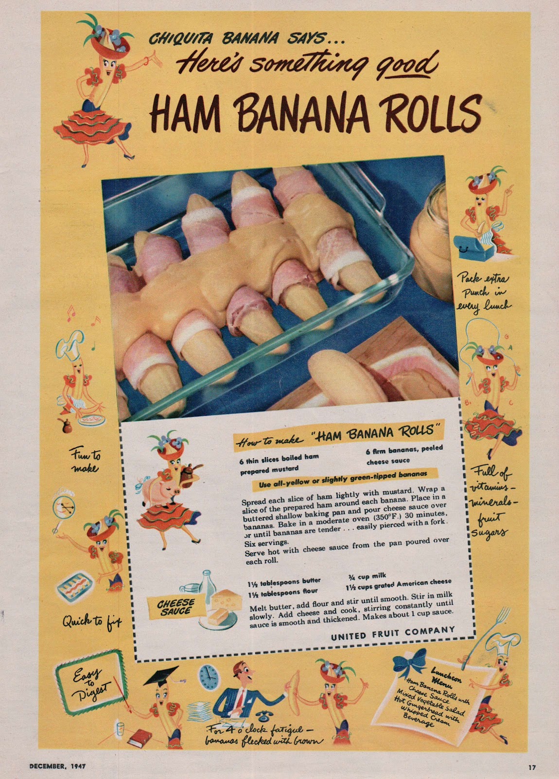 The United Fruit Company, parent company of Chiquita, advertised this recipe for decades from the post-war period through the 1970s. This particular advertisement suggests Ham and Banana Rolls as part of a luncheon menu that also includes a mixed vegetable salad and a hot gingerbread with whipped cream.